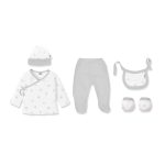 Το πρώτο σετ αποτελείται από ένα καπέλο, δύο γάντια, μια σαλιάρα, ένα μικρό μπλουζάκι και παντελονάκι με κλειστά πόδια, βασικά απαραίτητα και εύκολα στη χρήση. Το σετ ανήκει στη συλλογή παιδικής φροντίδας Interbaby και έχει μια πρωτότυπη και χαρούμενη εκτύπωση.