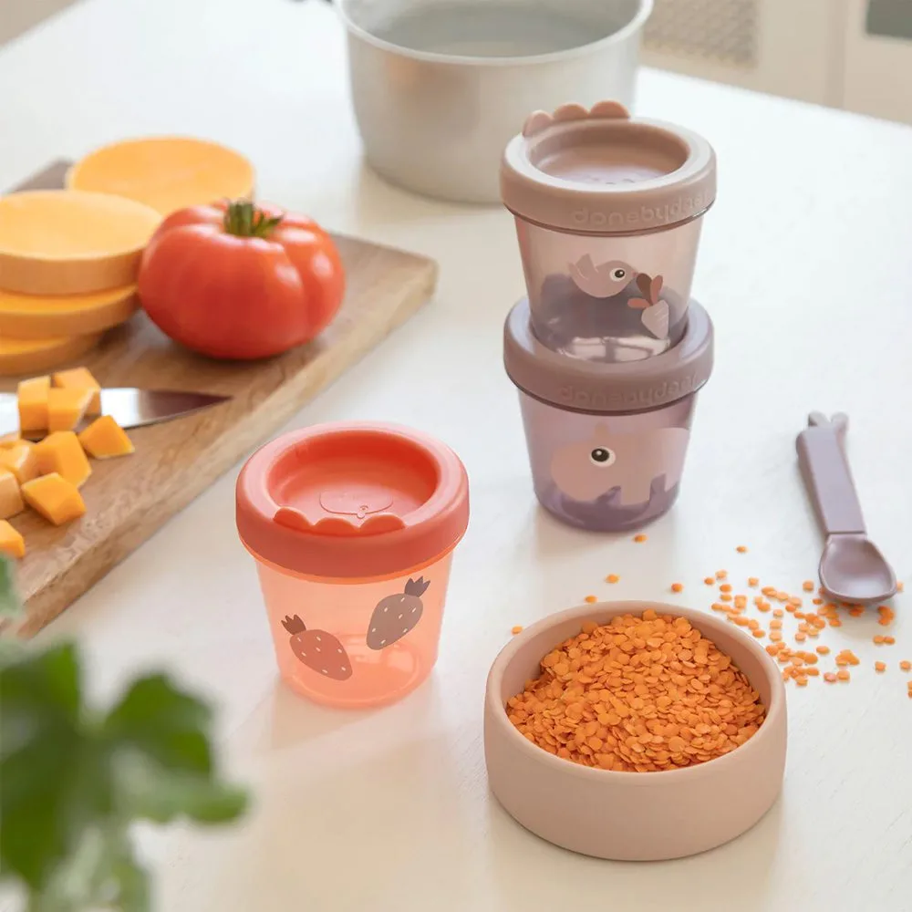 Χρησιμοποιήστε αυτό το πρακτικό σετ τριών δοχείων φαγητού για παιδικές τροφές και αφήστε ένα ελαφάκι- φίλο της Done by Deer να προσέχει τα καλούδια του μικρού σας μέσα. Είναι ιδανικά για να παίρνετε σνακ στο νηπιαγωγείο και όχι μόνο ή για να αποθηκεύετε τροφές στην κατάψυξη. Τα ημιδιαφανή δοχεία στοιβάζονται και αποθηκεύονται εύκολα κατά τη χρήση ή όταν τακτοποιούνται, ενώ το βιδωτό καπάκι τα καθιστά στεγανά και αεροστεγή. Διαθέτουν χαριτωμένες λεπτομέρειες με τον Croco στο καπάκι και με σχέδια και τα αγαπημένα τους σνακ. Αφήστε το μικρό σας να απολαύσει ένα μικρό γεύμα με τους φίλους της Done by Deer. Τα δοχεία παιδικής τροφής σε αποχρώσεις του ροζ έχουν διαφορετικά σχέδια. Το ένα έχει με την Birdee να πετάει με ένα καρότο, το άλλο με τον Ozzo να ψάχνει για σνακ και το τρίτο με φράουλες.