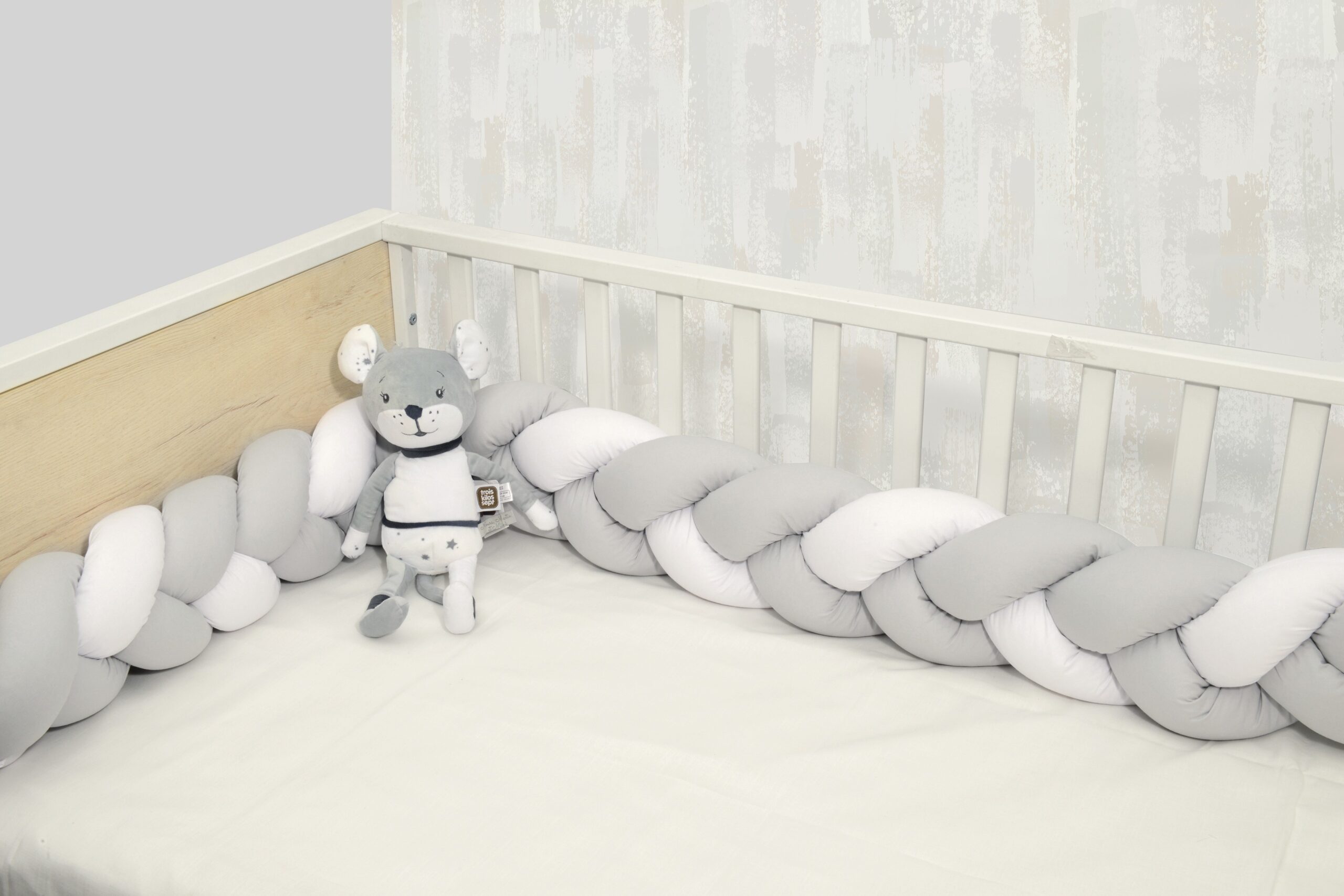 Πλεξούδα προστασίας κρεβατιού – Εξωτερικό ύφασμα ζακάρ ζέρσευ 100% βαμβάκι με πιστοποίηση Oekotex – εσωτερικό 100% σιλικονούχος πολυέστερας. Διάσταση περίπου: 20Χ200CM. Πλύσιμο στο χέρι. Συσκευασία σε σακούλα PVC με φερμούαρ. Ελληνικής Ραφής.